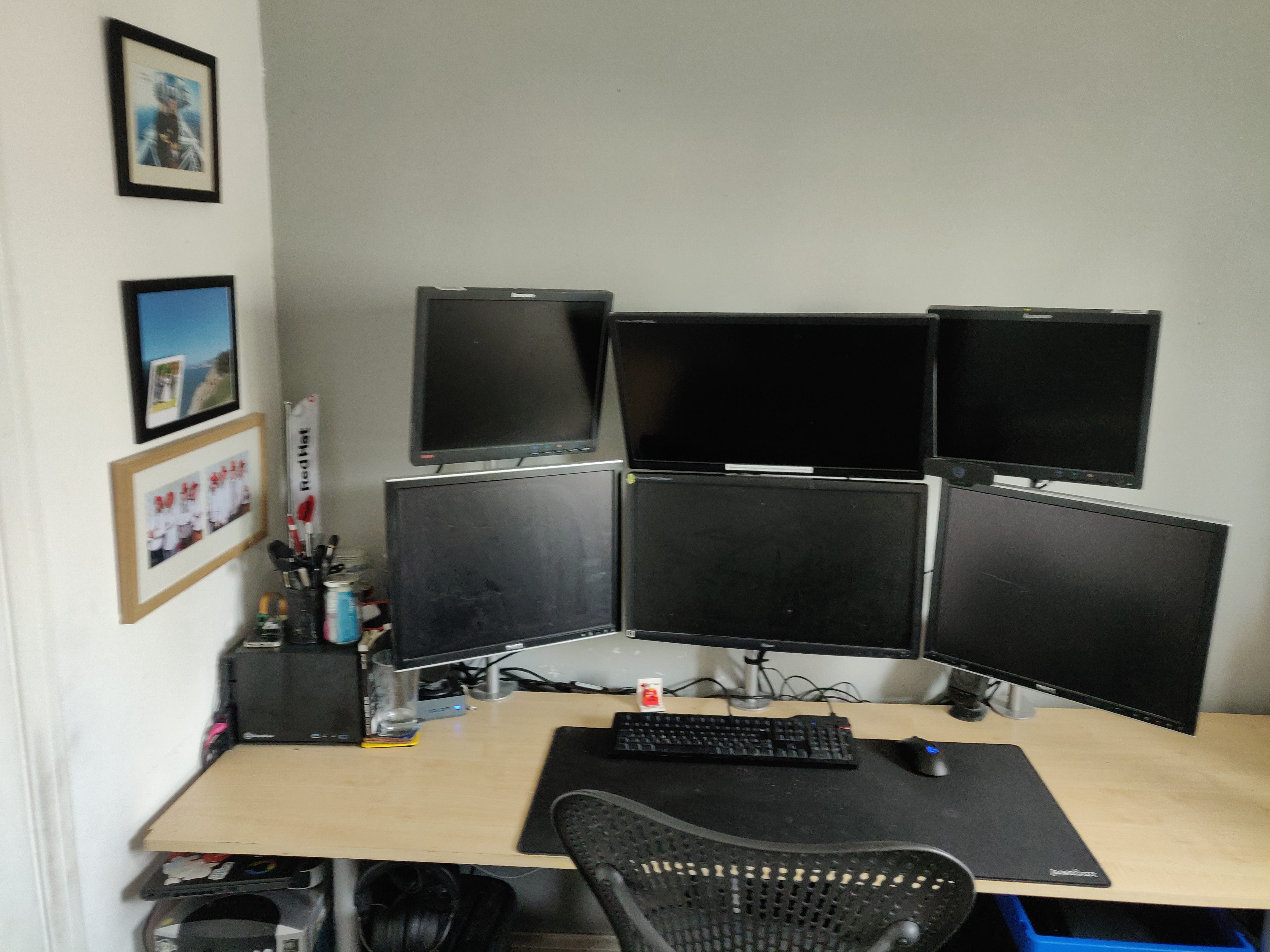 Pictured above, is my desk. It does indeed have 6 monitors. It also has 4 computers with 3 operating systems (2x Linux, 1x Windows — for gaming, 1x Mac — for iOS development).
